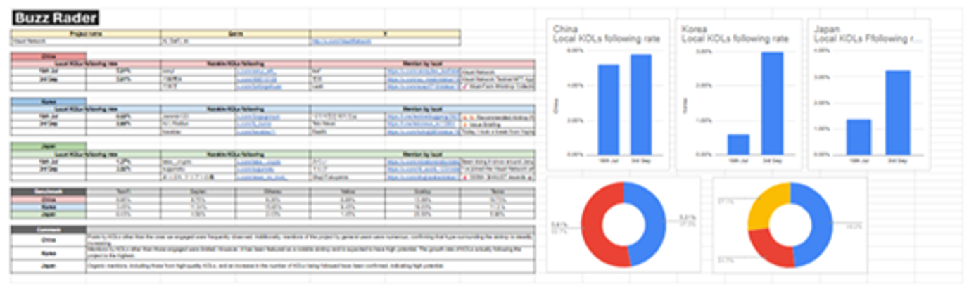 Buzz RadarはFEBが持つ中国、韓国、日本の約5,000件のスマートアカウントデータを活用し、ターゲットプロジェクトの各地域におけるスマートフォロワーの数や属性、プロジェクトに関連する言及を抽出、分析することを可能にします。